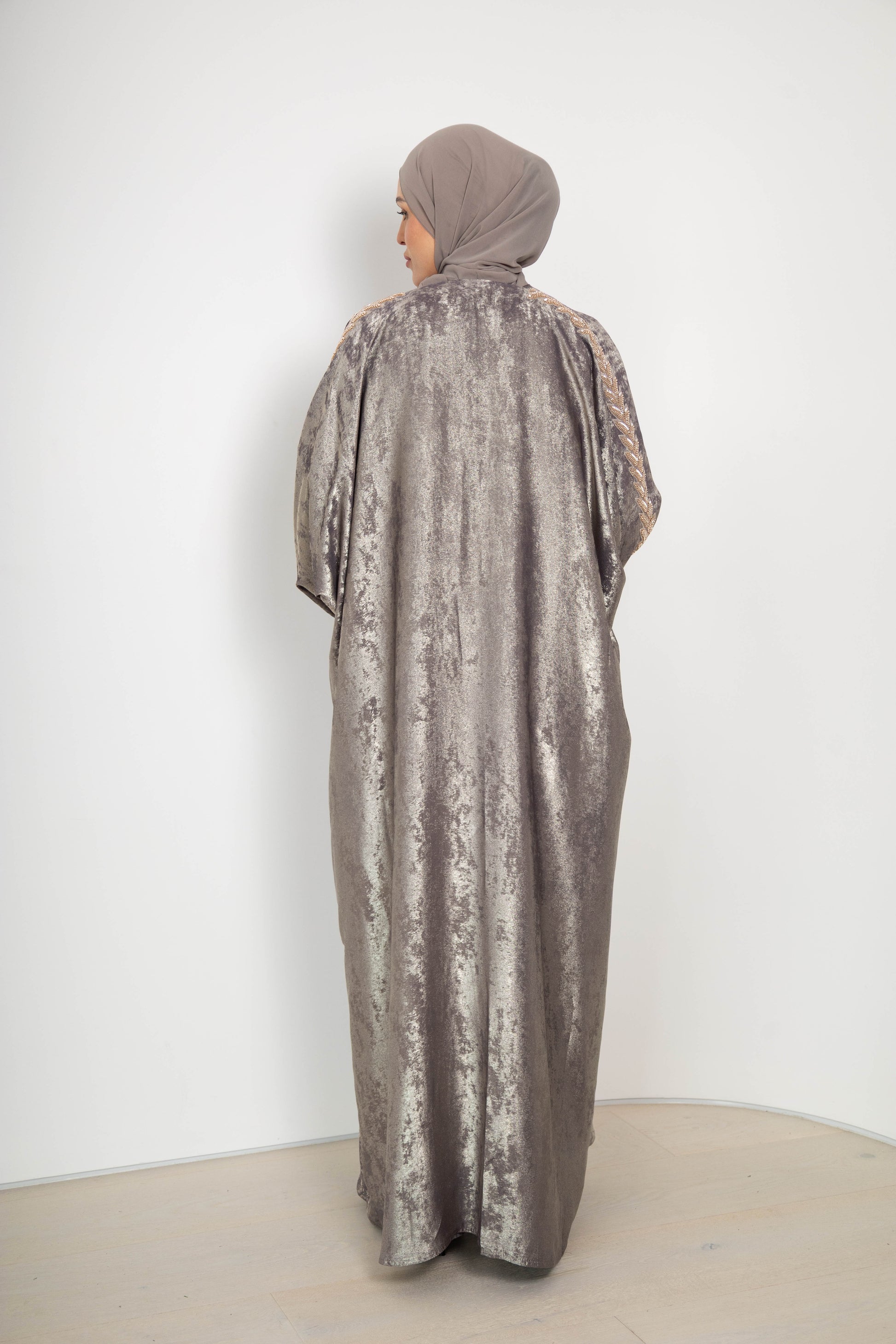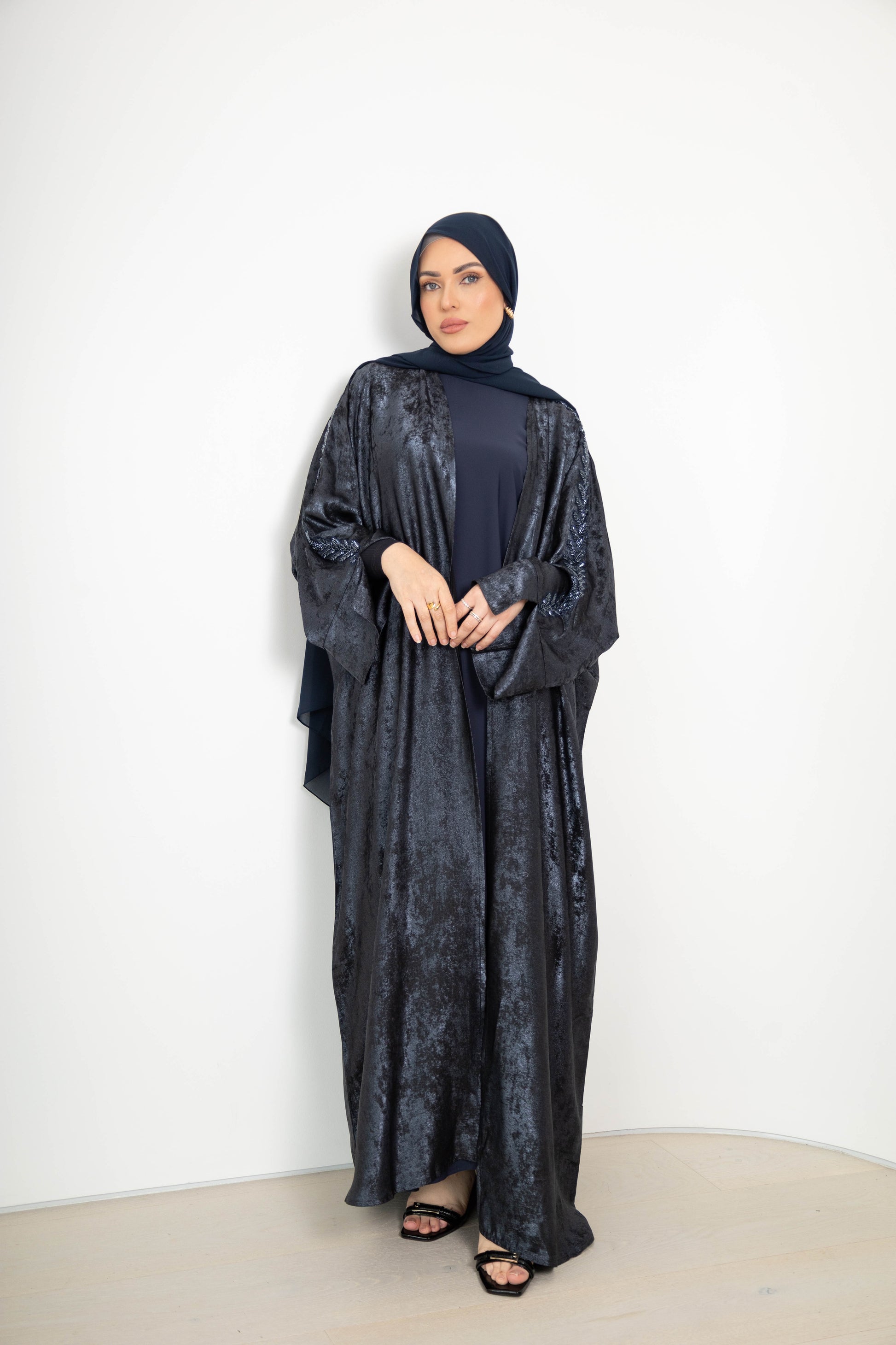 Crafted from rich crushed velvet, the abaya features a luminous, metallic-like sheen that shifts beautifully with movement. Available in deep navy, classic black, and a soft platinum tone, each piece is finished with delicately beaded embroidery along the sleeves for an understated touch of glamour.
