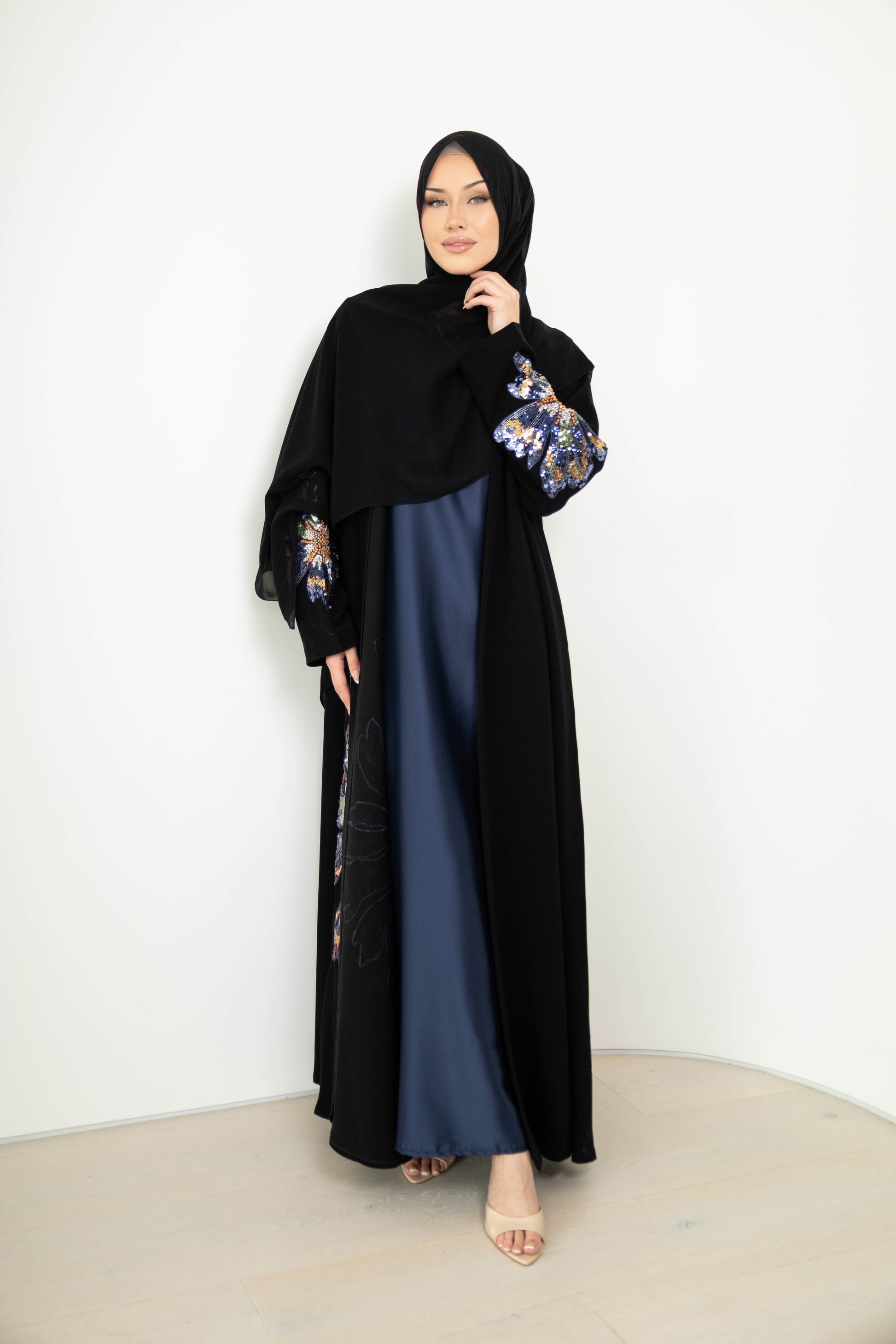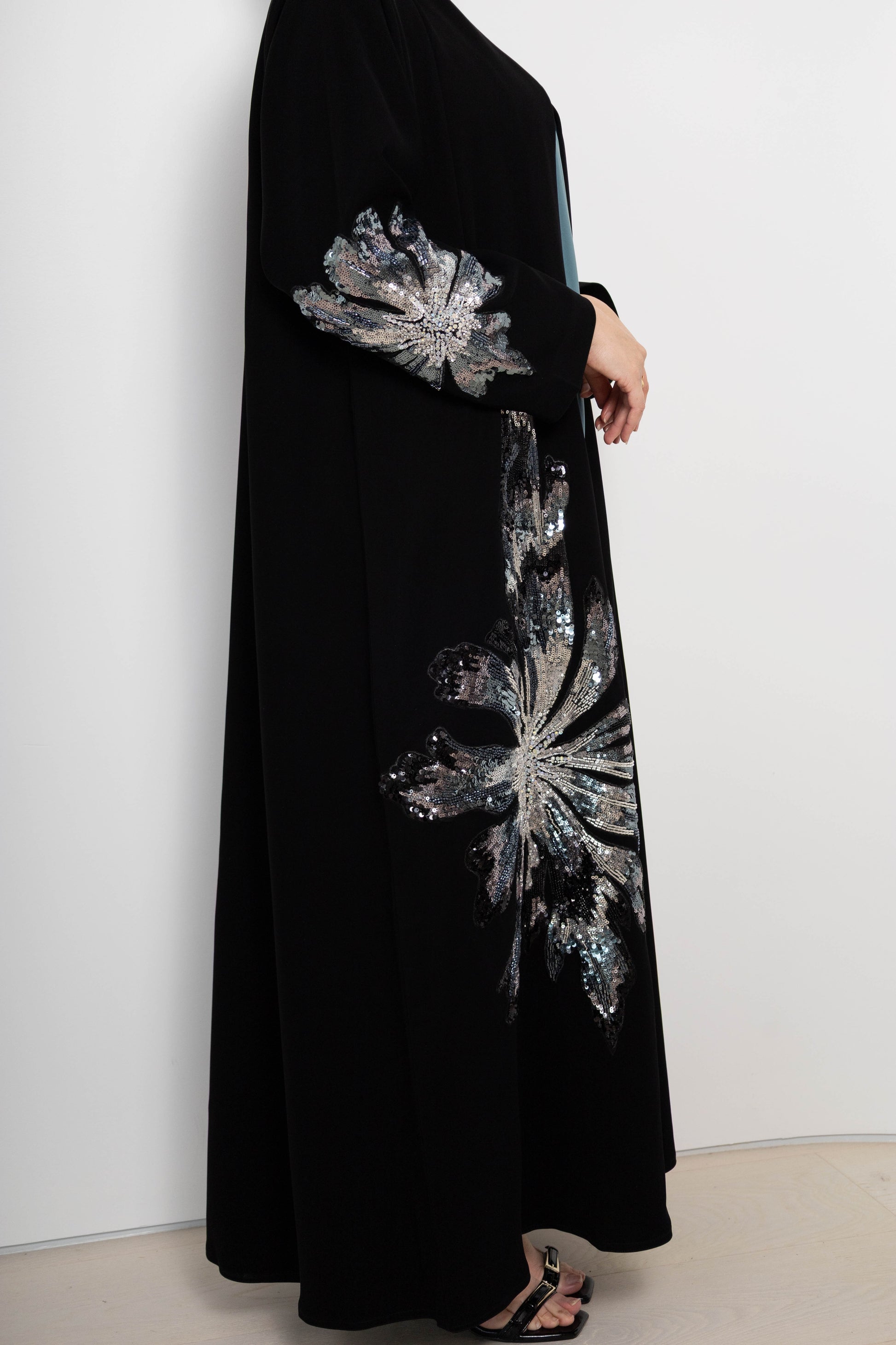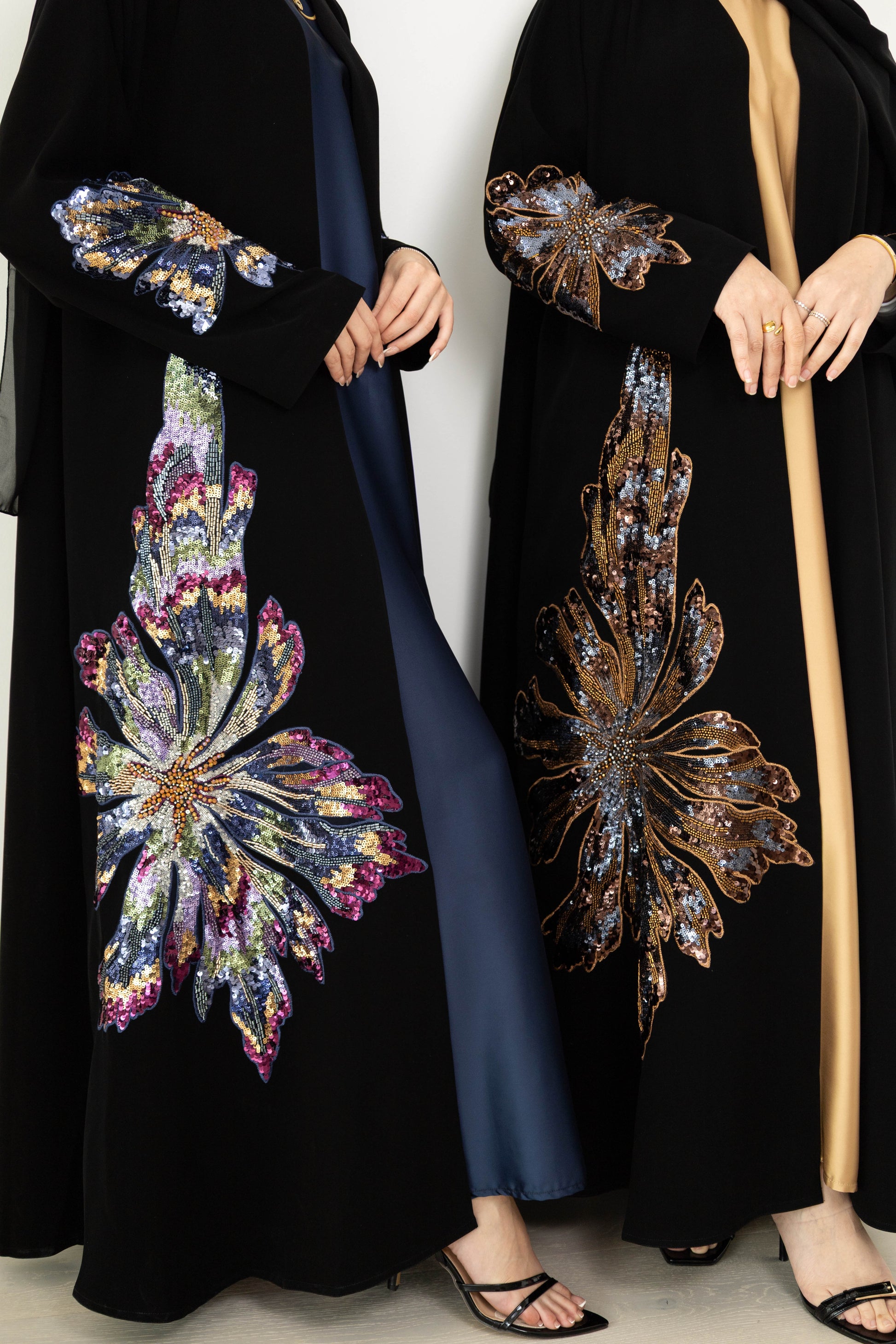 The outer abaya features a bold, oversized sequin floral motif that cascades vertically, available in your choice of ruby pink, navy, gold, or silver. The sequin detailing continues on the sleeves, creating a fluid, cohesive silhouette. The inner slip mirrors the floral tones for a soft, graceful contrast that ties the entire look together.