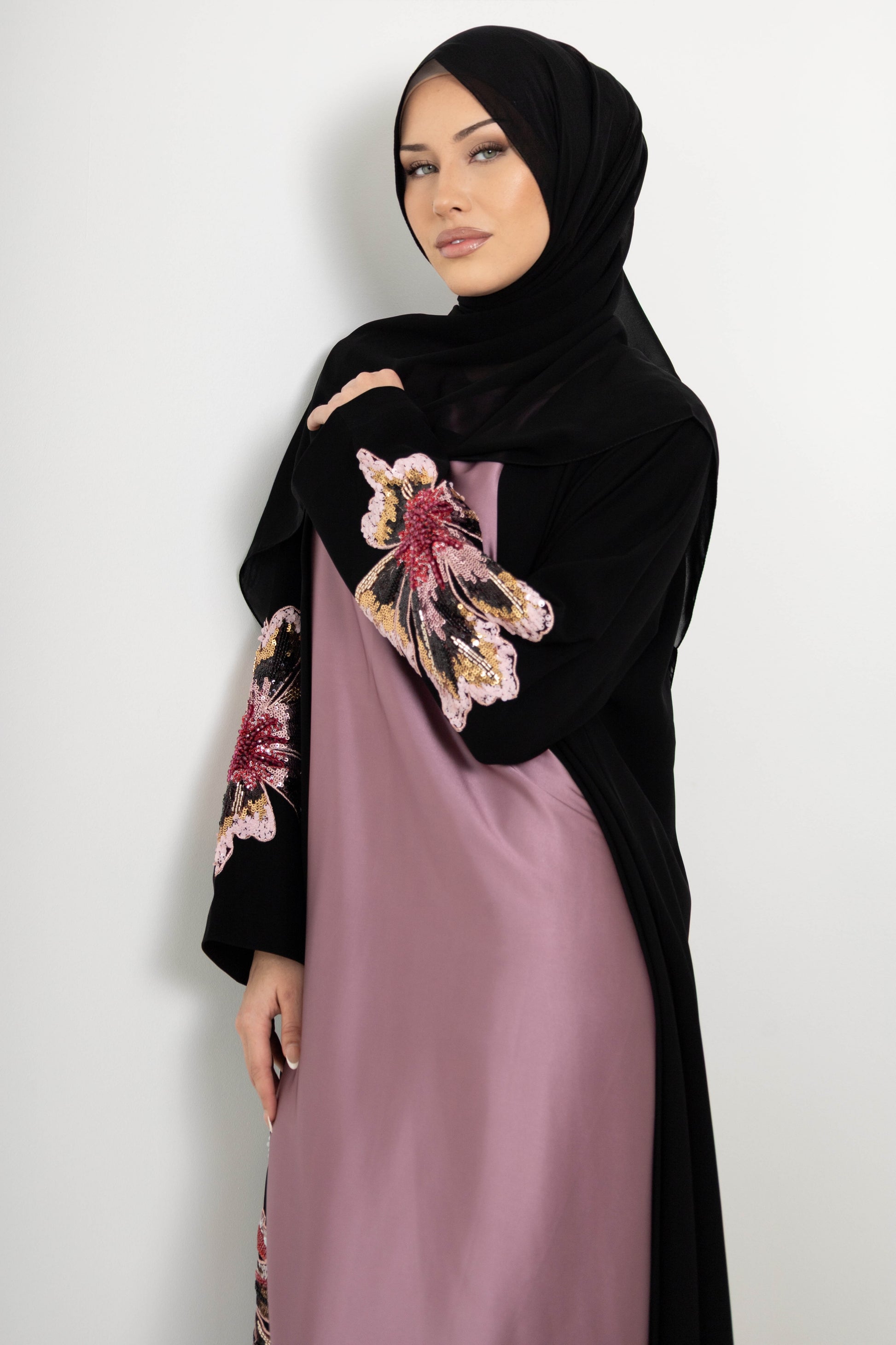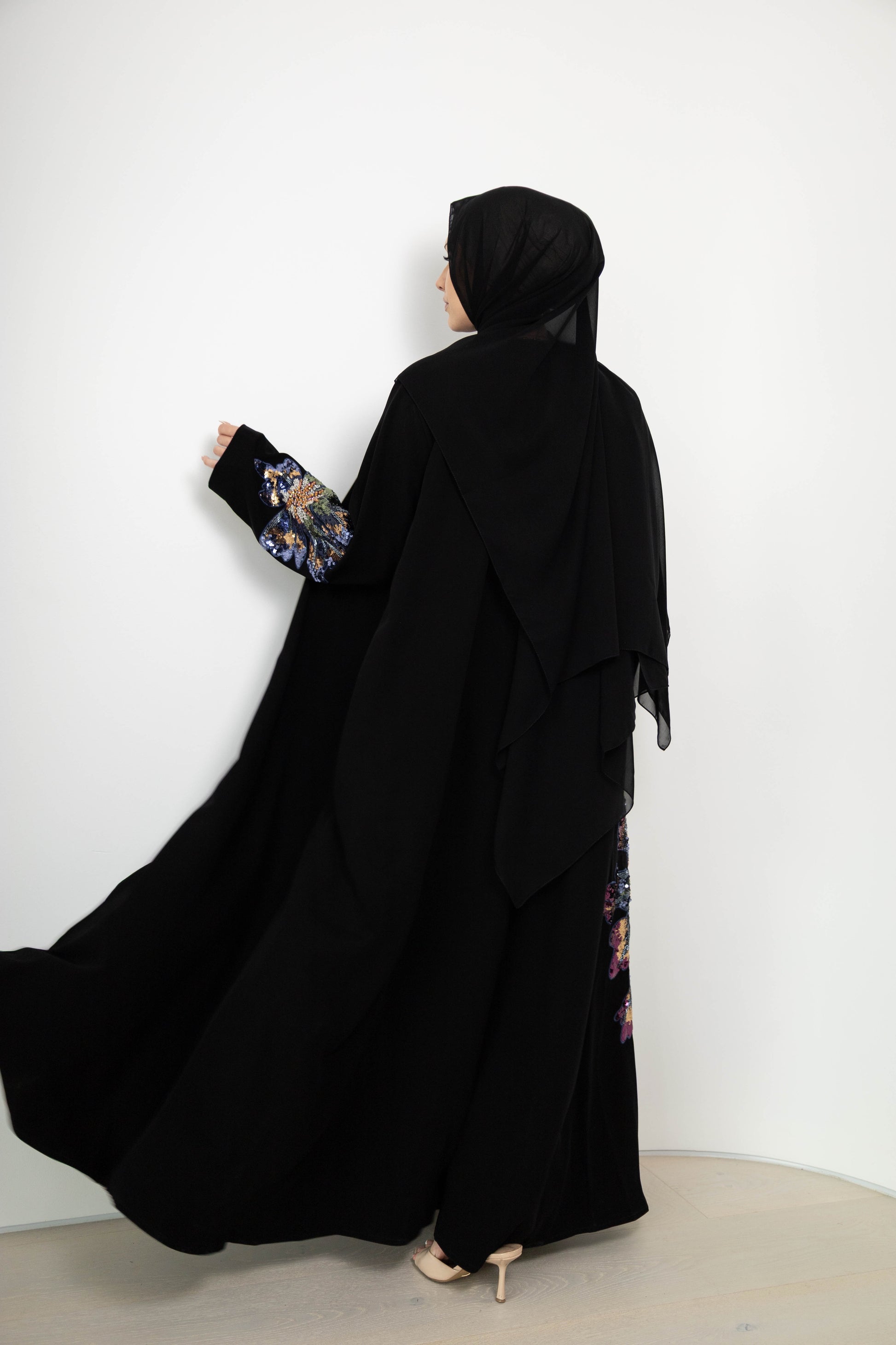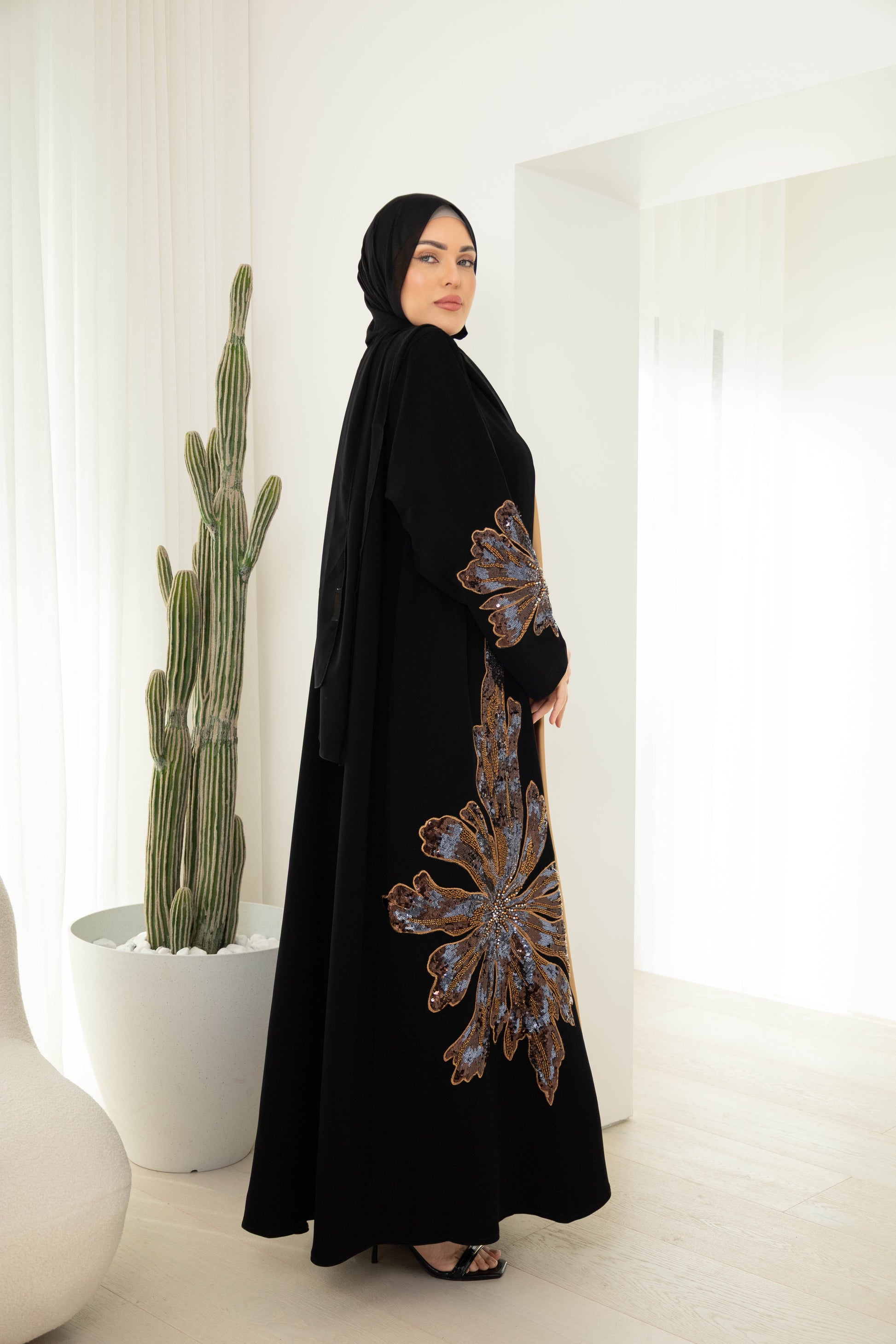 The outer abaya features a bold, oversized sequin floral motif that cascades vertically, available in your choice of ruby pink, navy, gold, or silver. The sequin detailing continues on the sleeves, creating a fluid, cohesive silhouette. The inner slip mirrors the floral tones for a soft, graceful contrast that ties the entire look together.