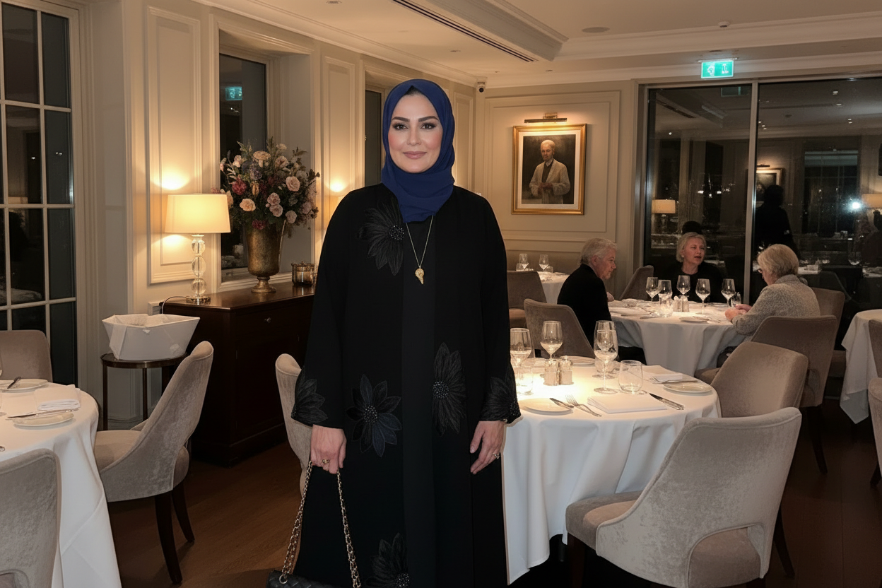 The flowing open abaya drapes effortlessly over a matching inner dress, while the bold bloom details add depth, artistry, and undeniable presence. Perfect for intimate dinners, elegant soirées, and elevated everyday luxury.