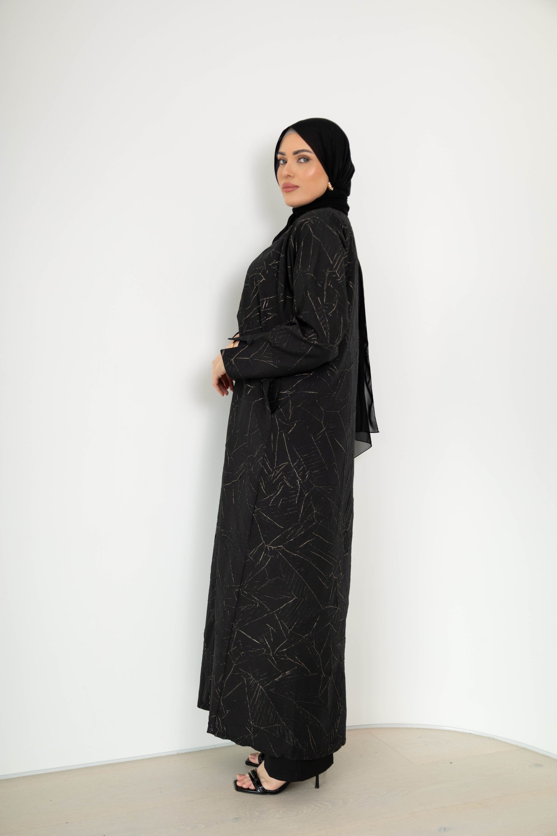 Features a minimalistic, linear shimmer pattern delicately spread across the abaya, adding a touch of modern glamour without overpowering its elegance.