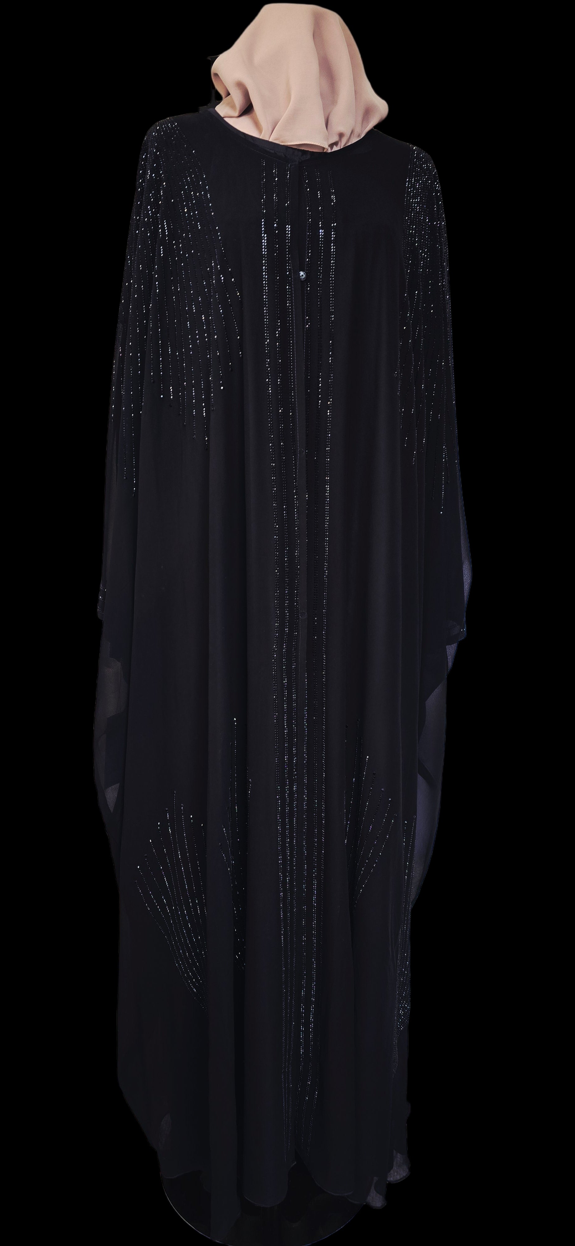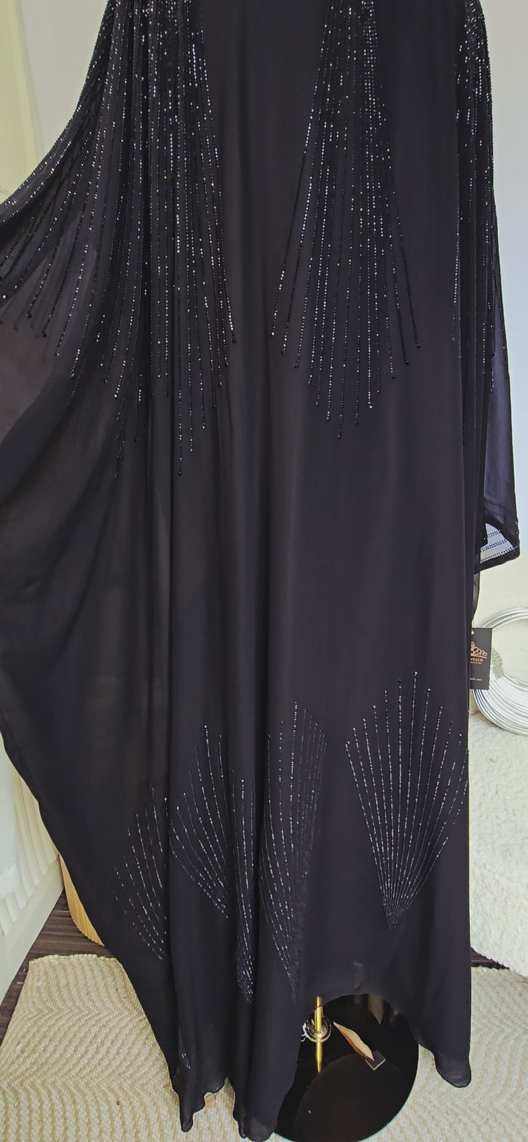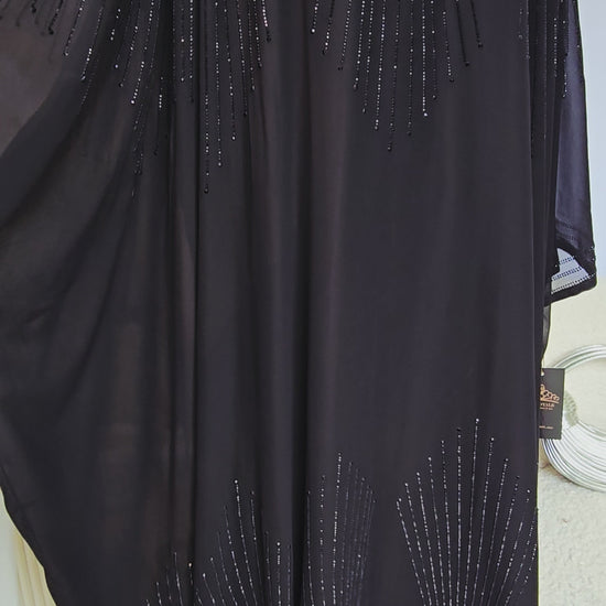 This elegant Fan Chiffon cape features a sleek, minimalist silhouette adorned with exquisite vertical beadwork. The embellishments consist of fine, jet-black beads arranged in neat, elongated lines that cascade from the shoulders down the bodice and along the wide batwing sleeves, creating a refined, elongating effect.