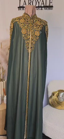 The Houda cape features soft chiffon fabric in a luxurious shade of green, adorned with delicate gold embellishments along the shoulder, arm and hemline.