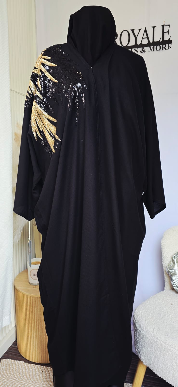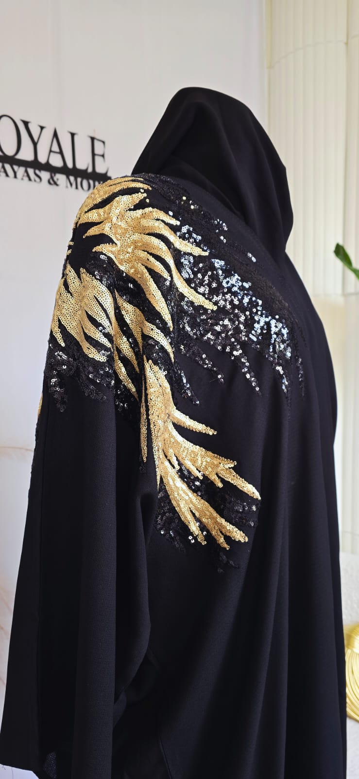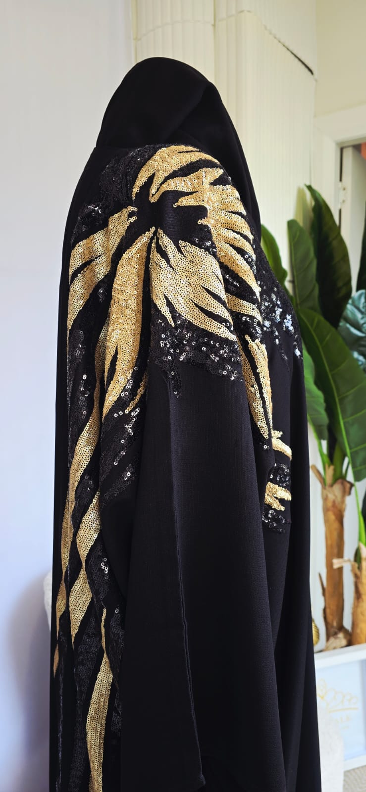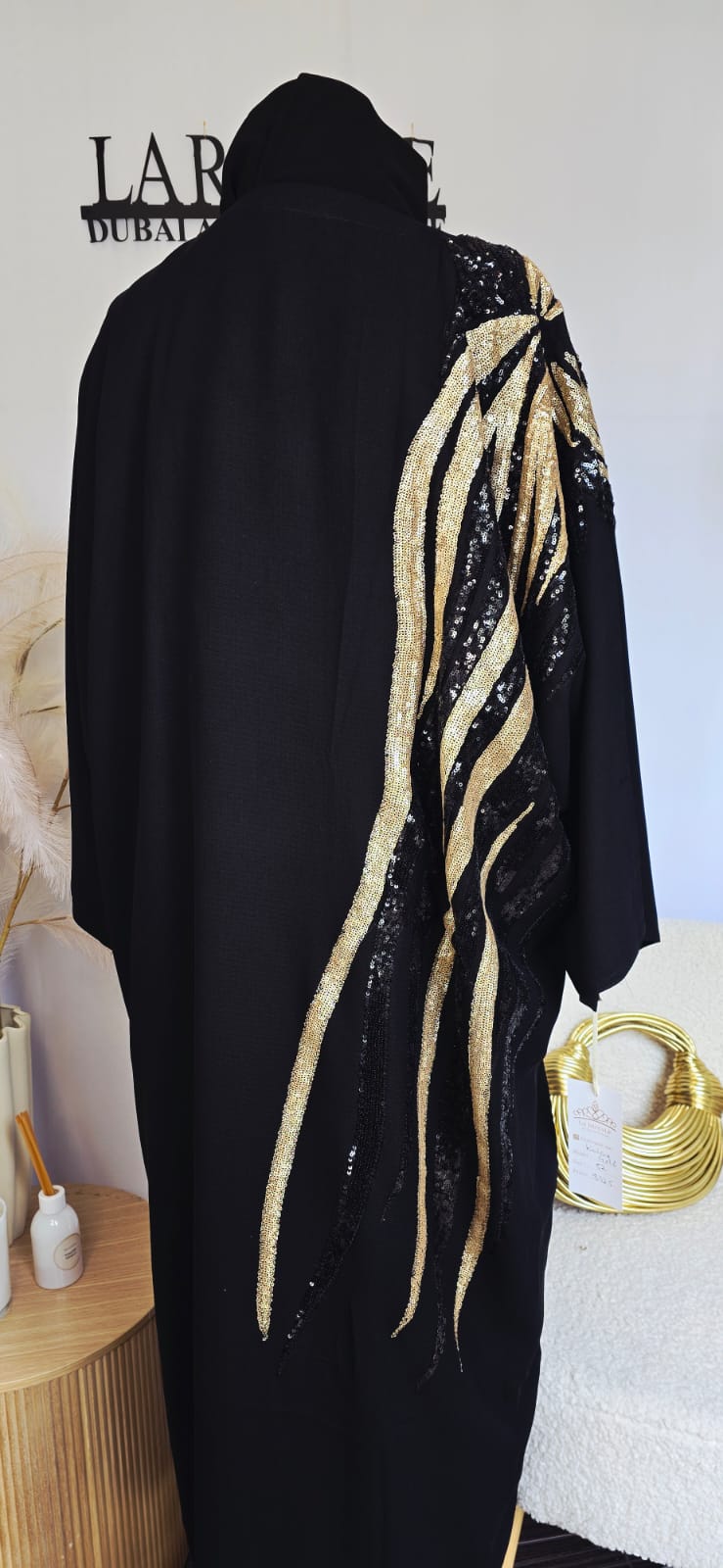 The gold embellishment is framed by shimmering black sequins, creating depth and contrast while catching the light beautifully with every movement. Crafted from a rich, flowy fabric, the abaya exudes elegance and opulence, making it perfect for special occasions or evening events where a regal, standout look is desired.
