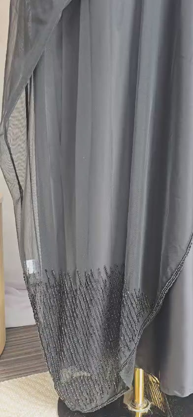This elegant LA ROYALE beaded Chiffon abaya exudes sophistication with its luxurious black design adorned in intricate vertical beadwork that cascades gracefully across the bodice and down the wide batwing sleeves.