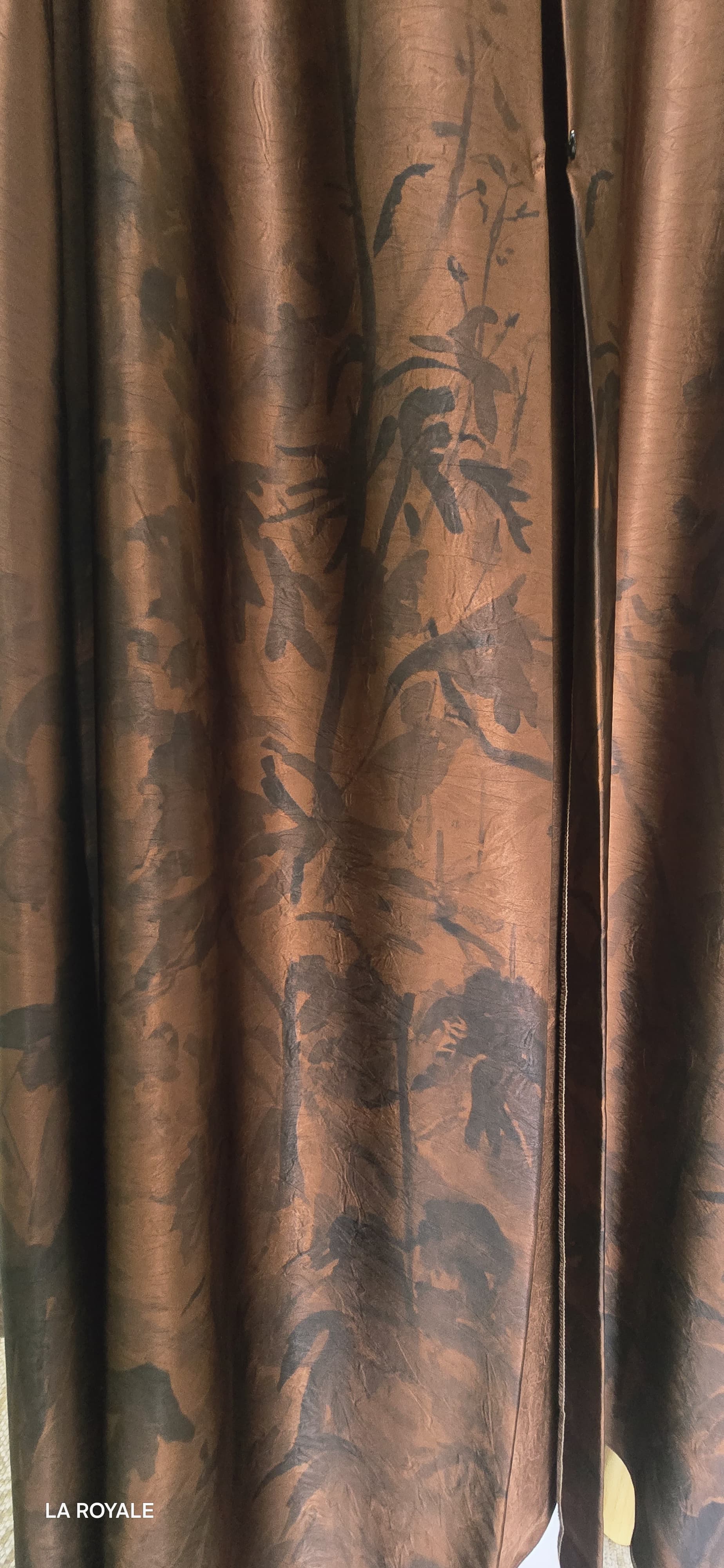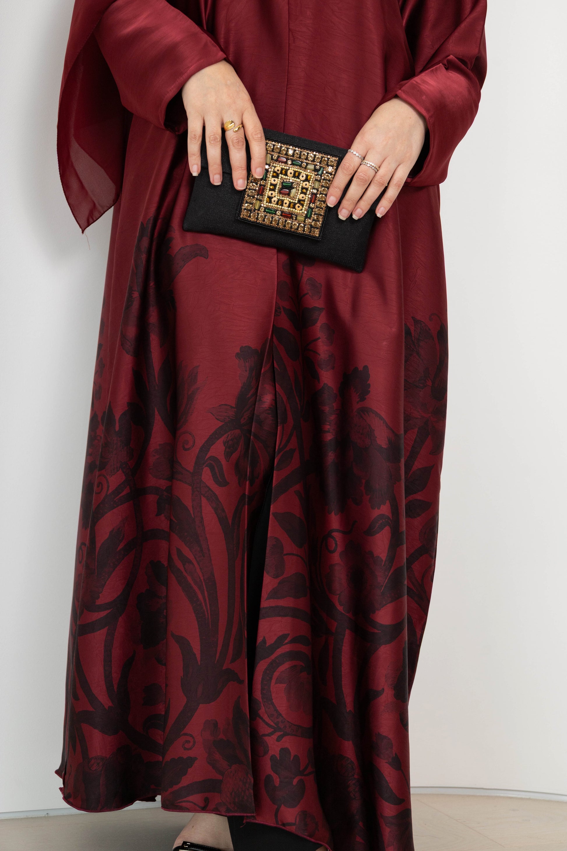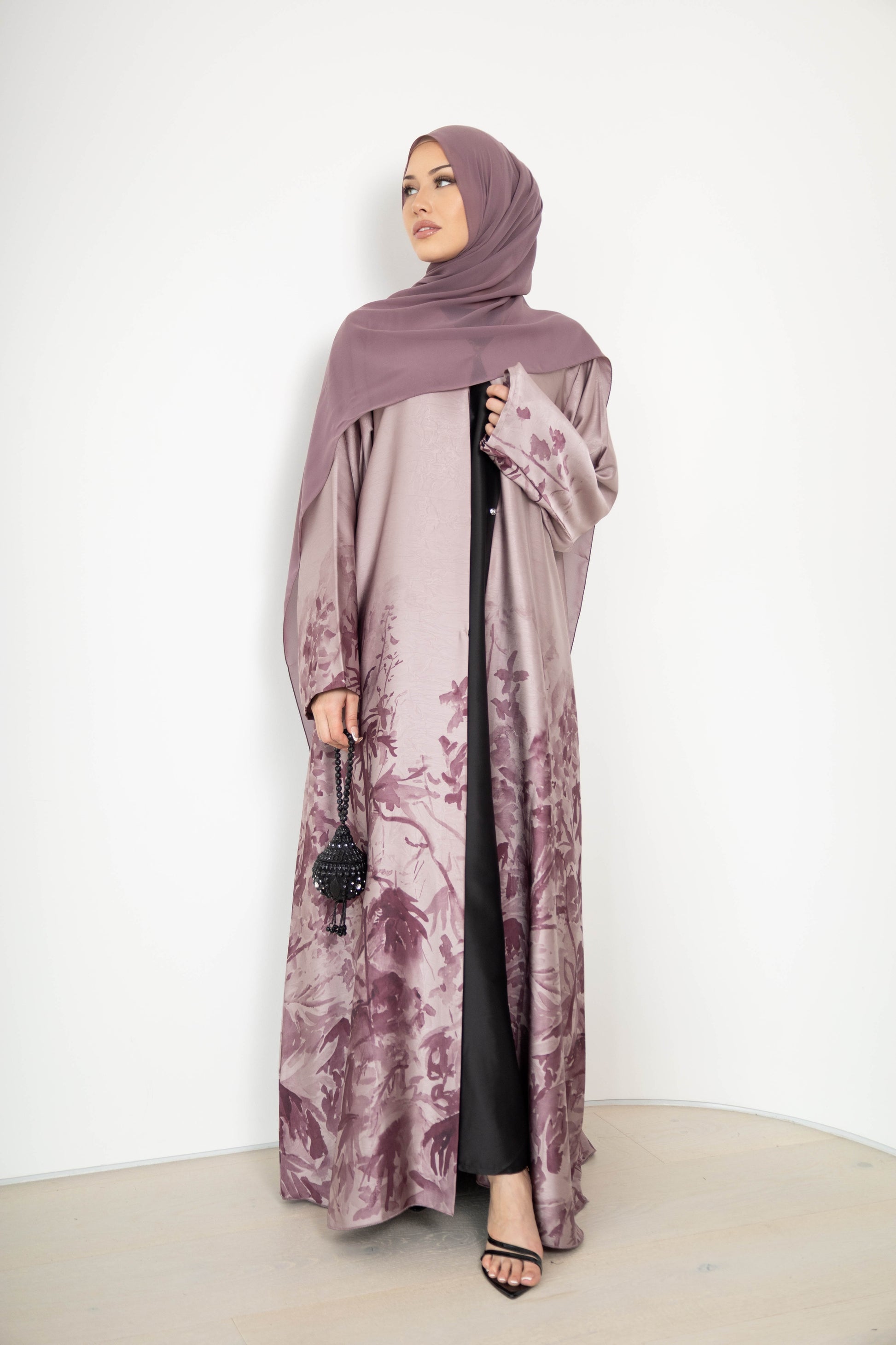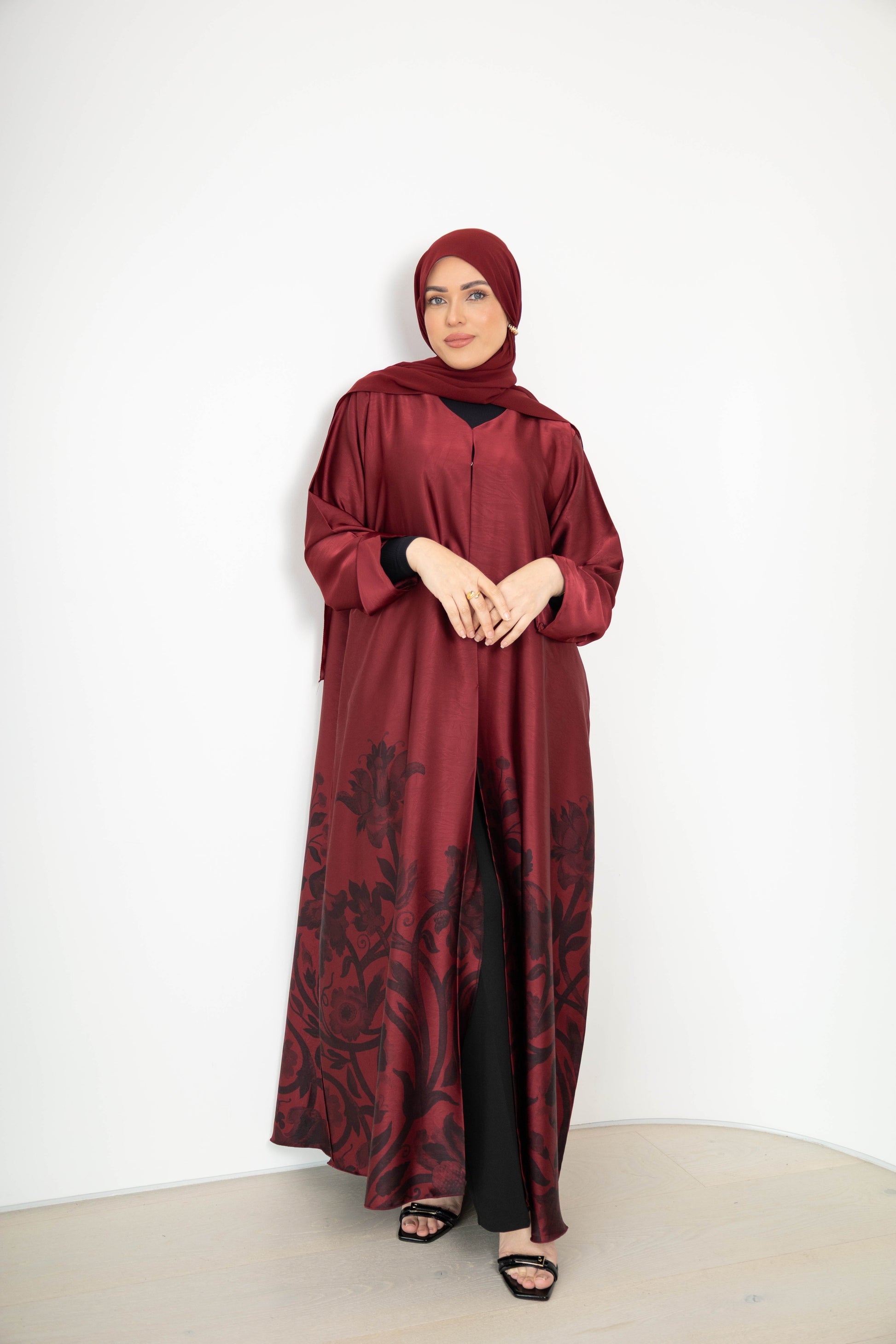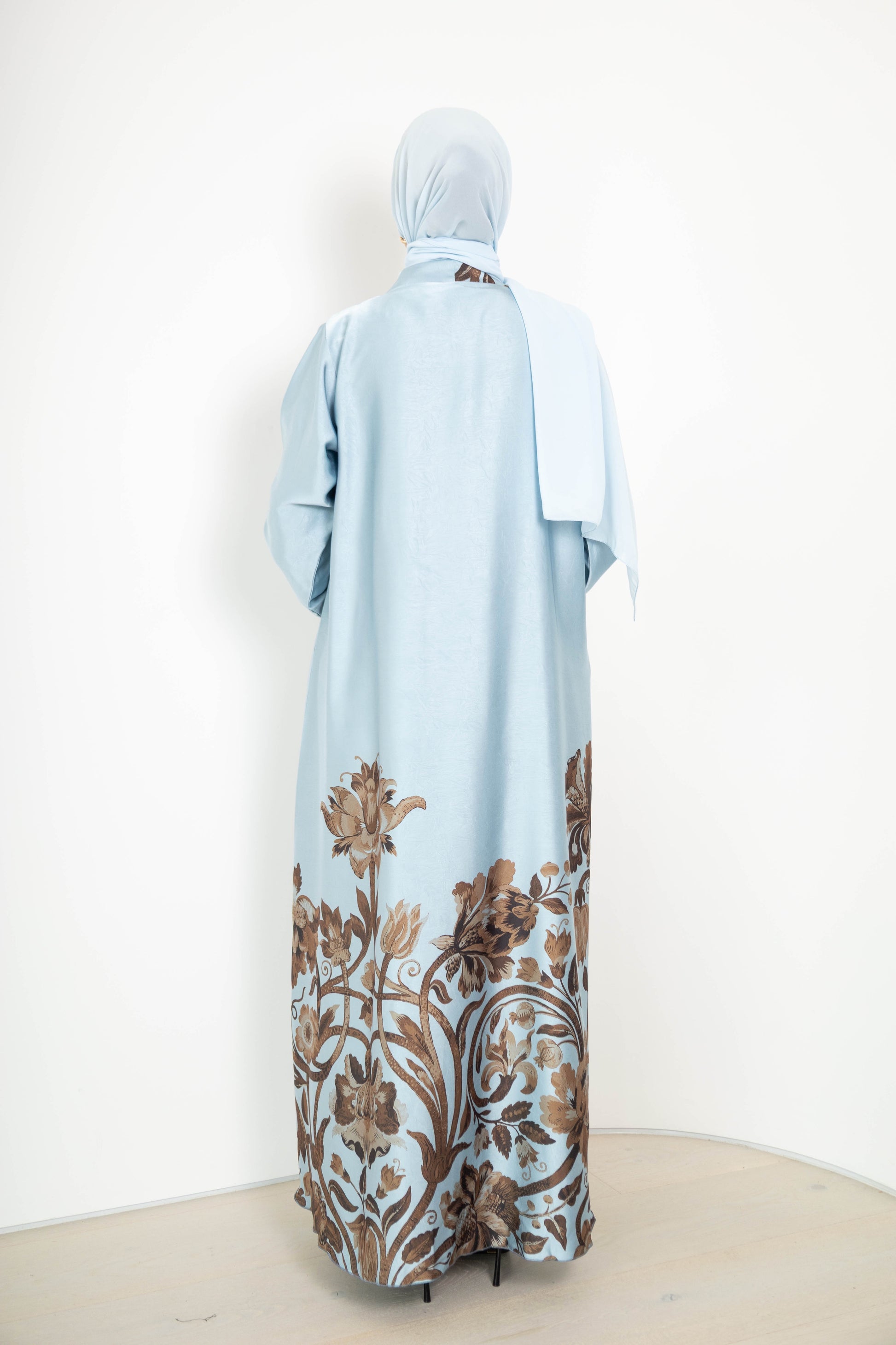 Elegant and artistic, the Lujayn Abaya is a statement in graceful refinement. Crafted from matt satin with a subtle jacquard finish, this piece features an ornate floral print that rises from the hem in rich contrast—giving the illusion of a blooming silhouette.
