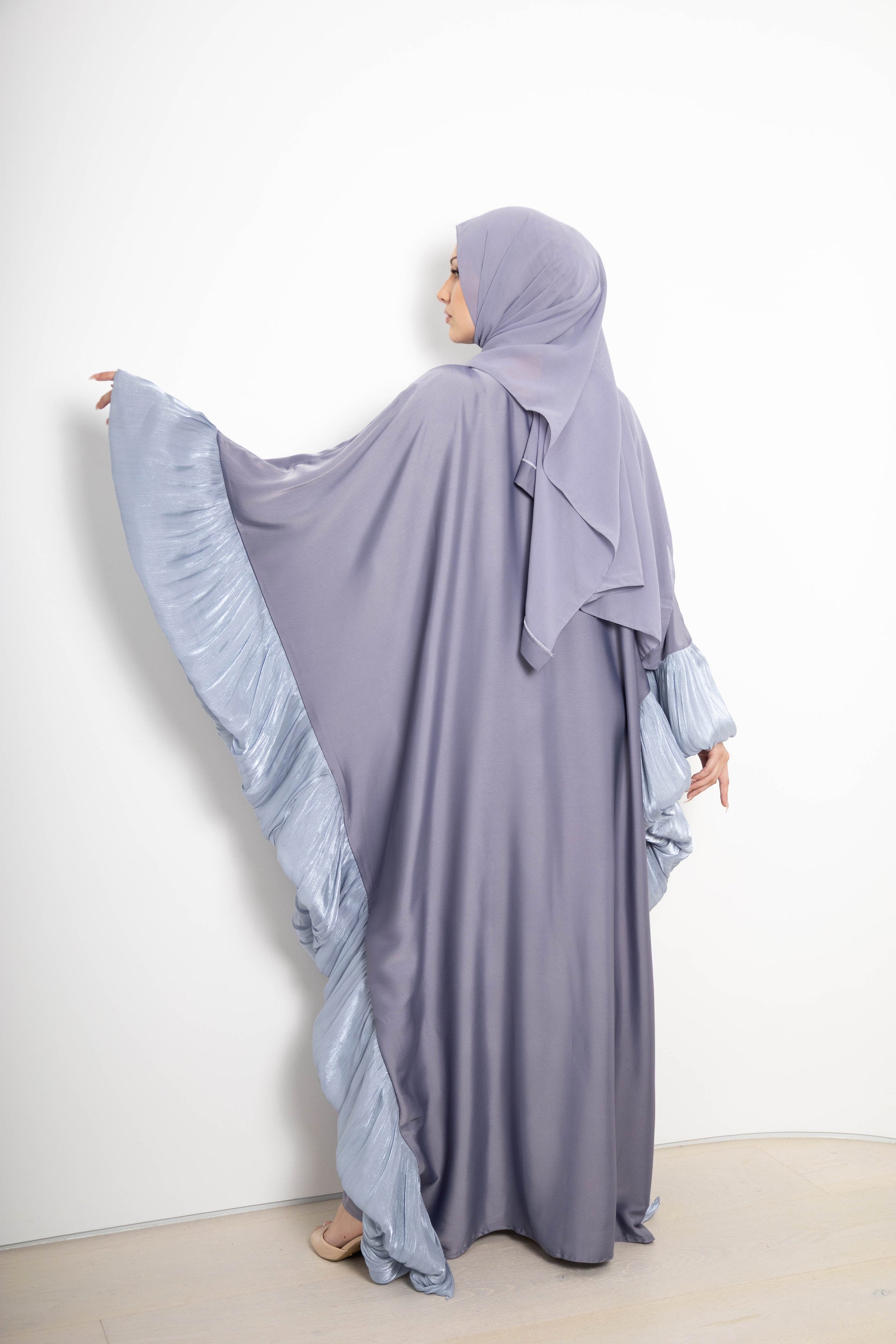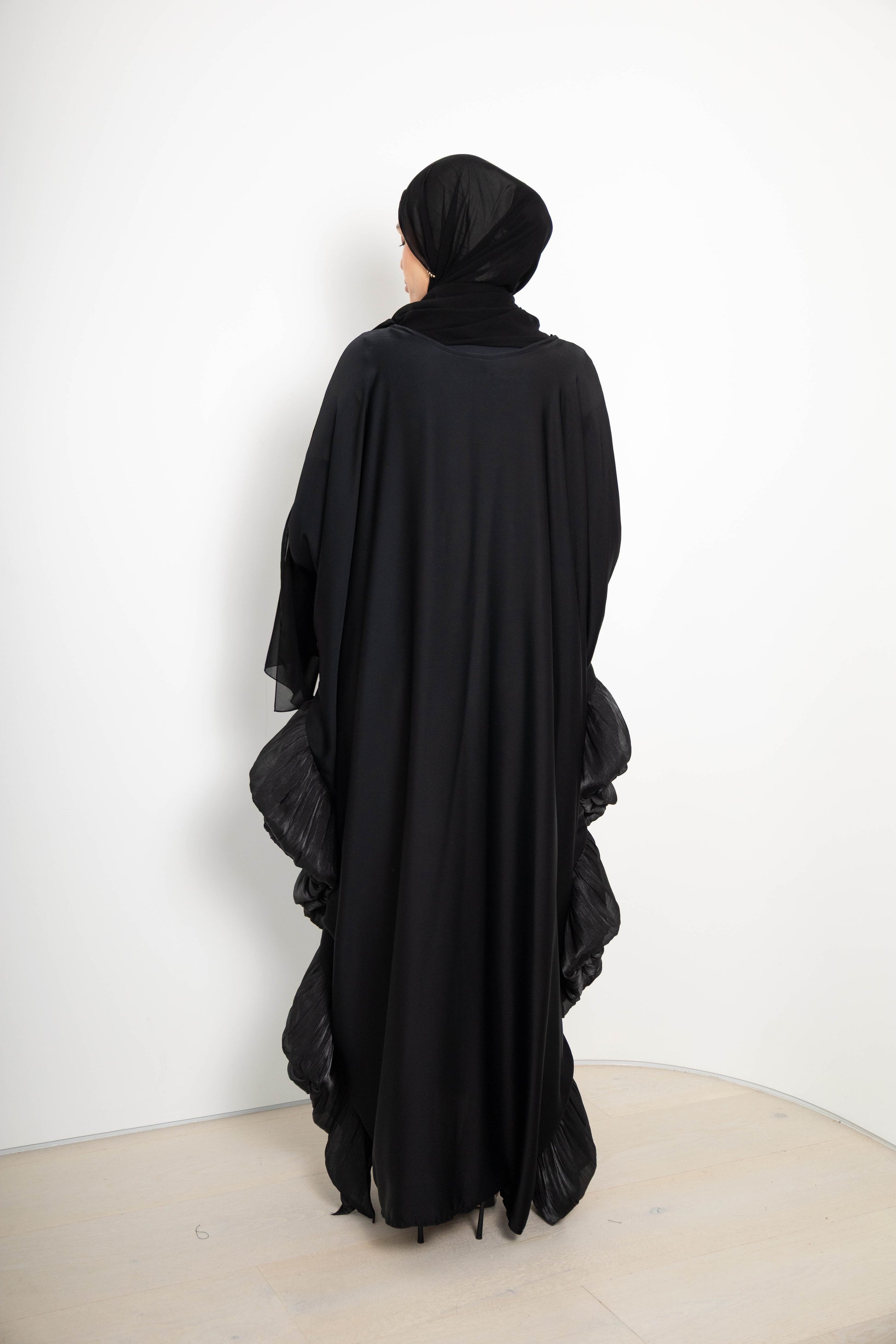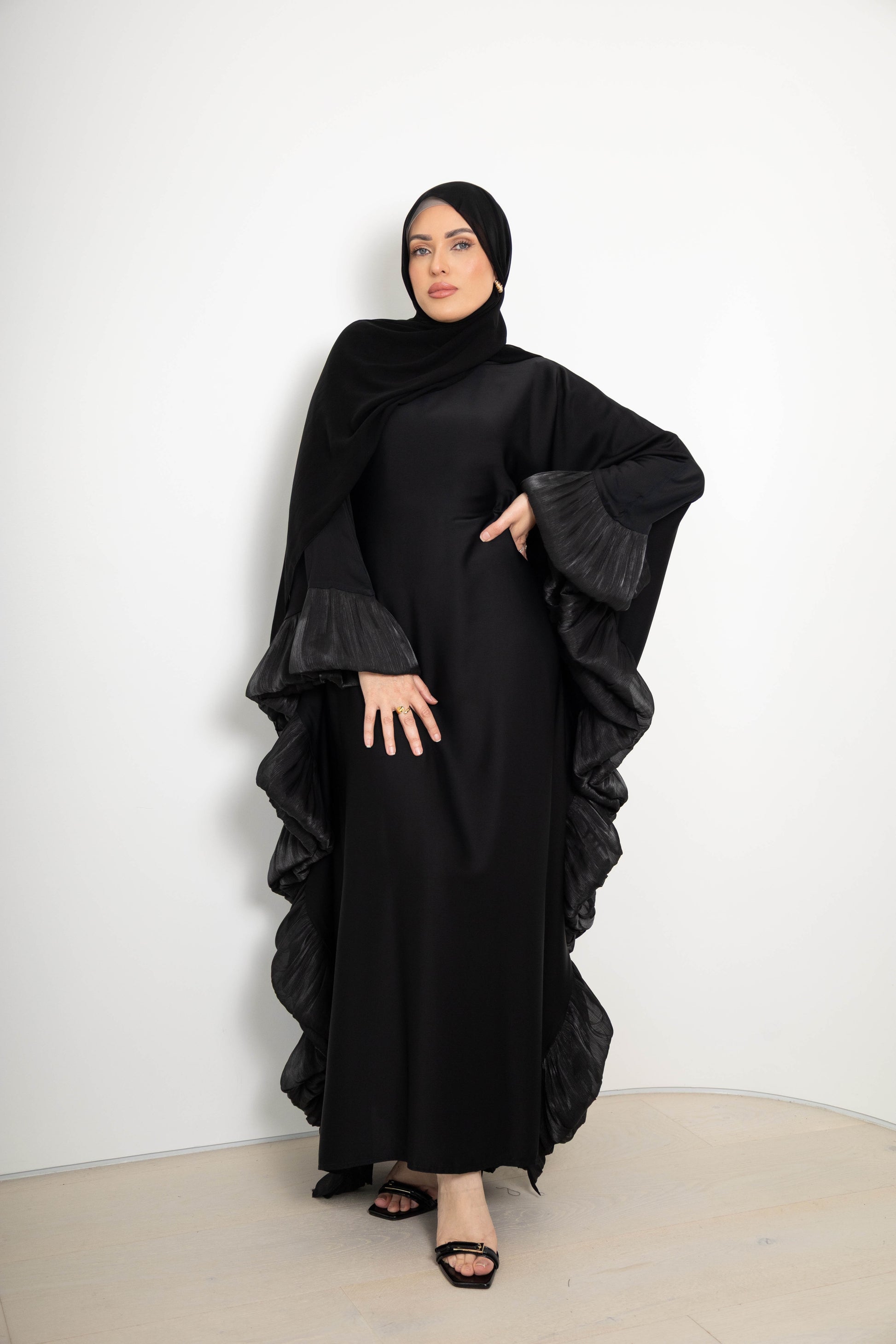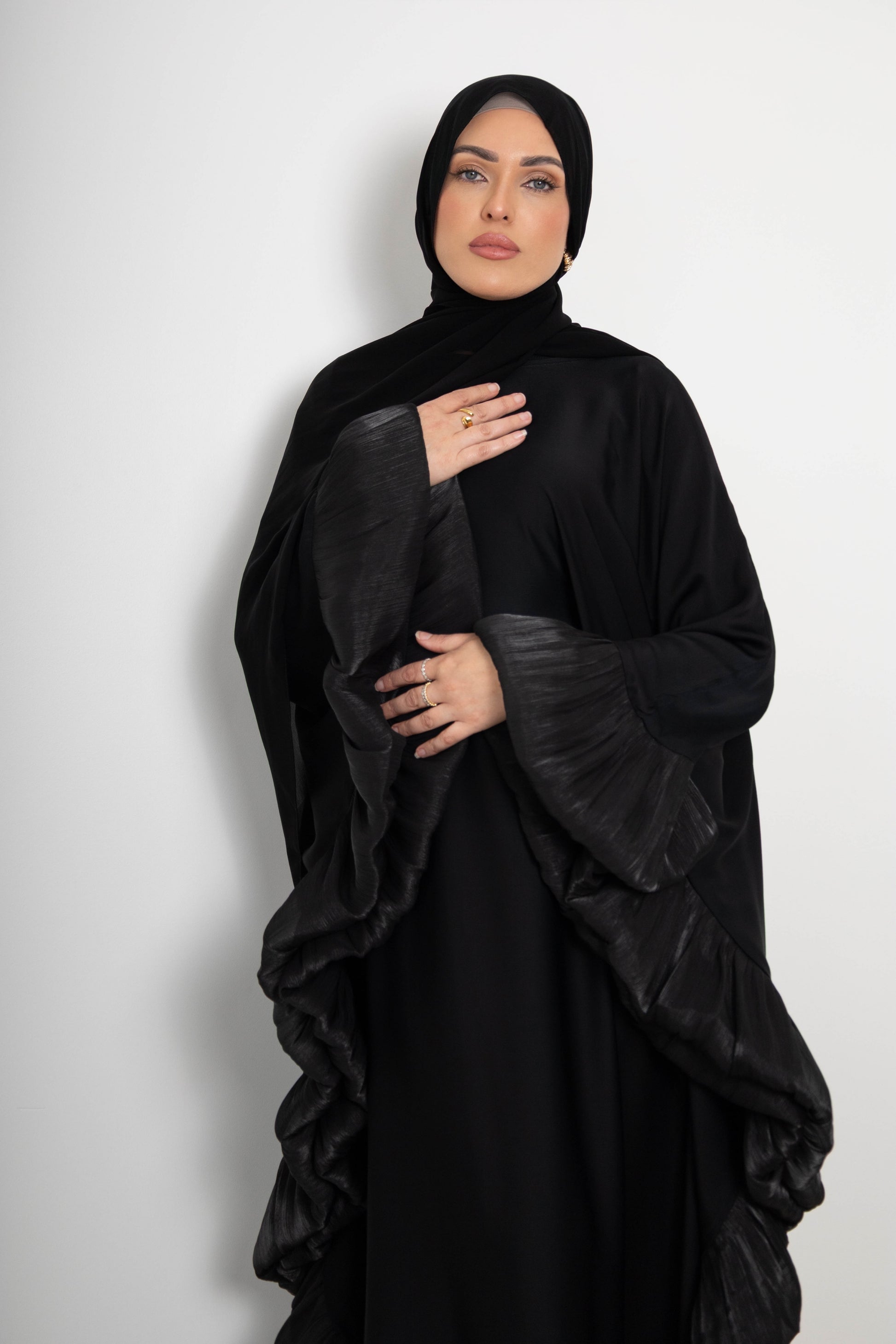 Voluminous yet elegant, the Maria Ruffle Batwing Abaya adds drama through soft movement. Featuring pleated shimmer ruffle trim along the sleeves and hem, this design flows with every step and catches the light in all the right ways.