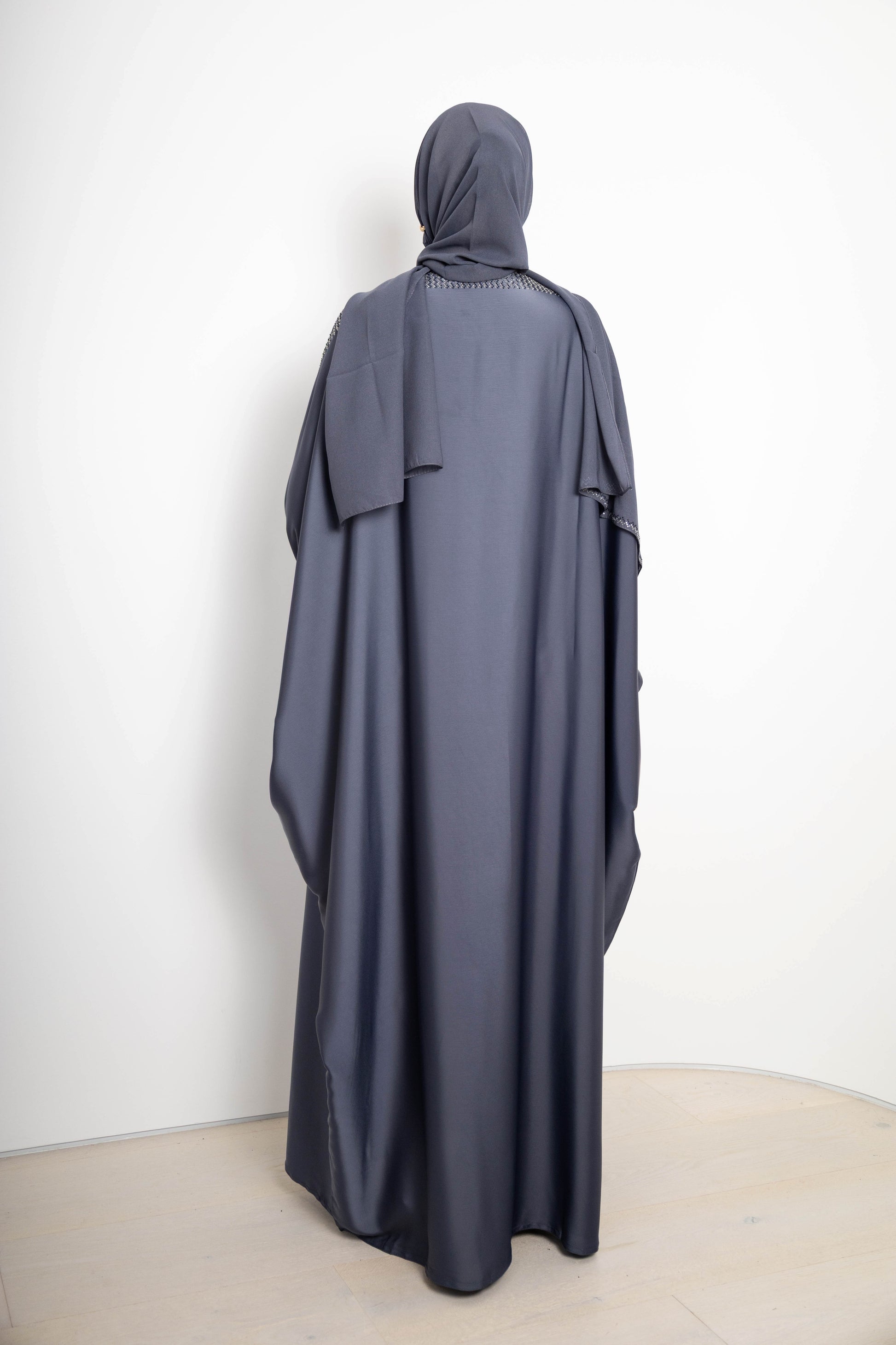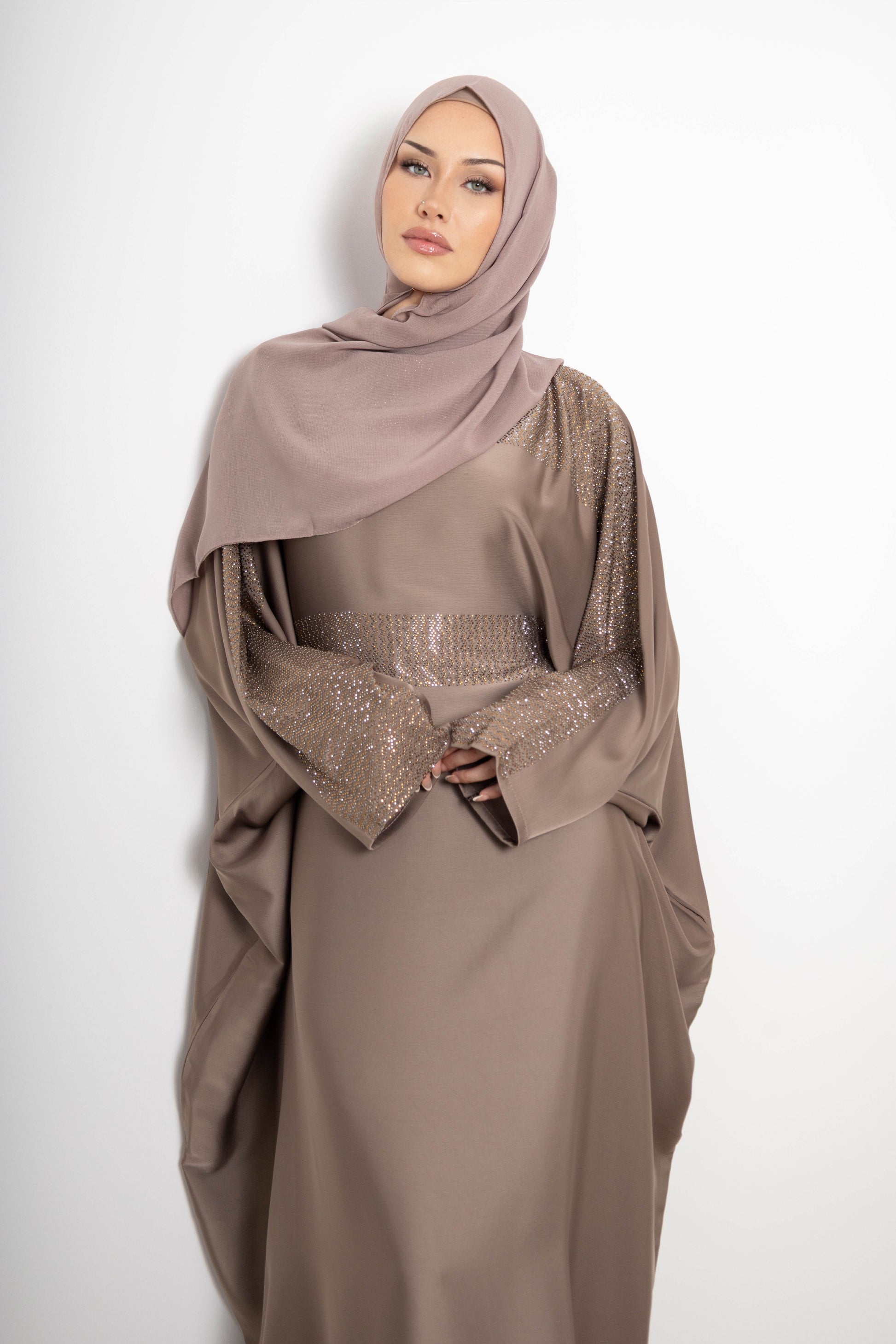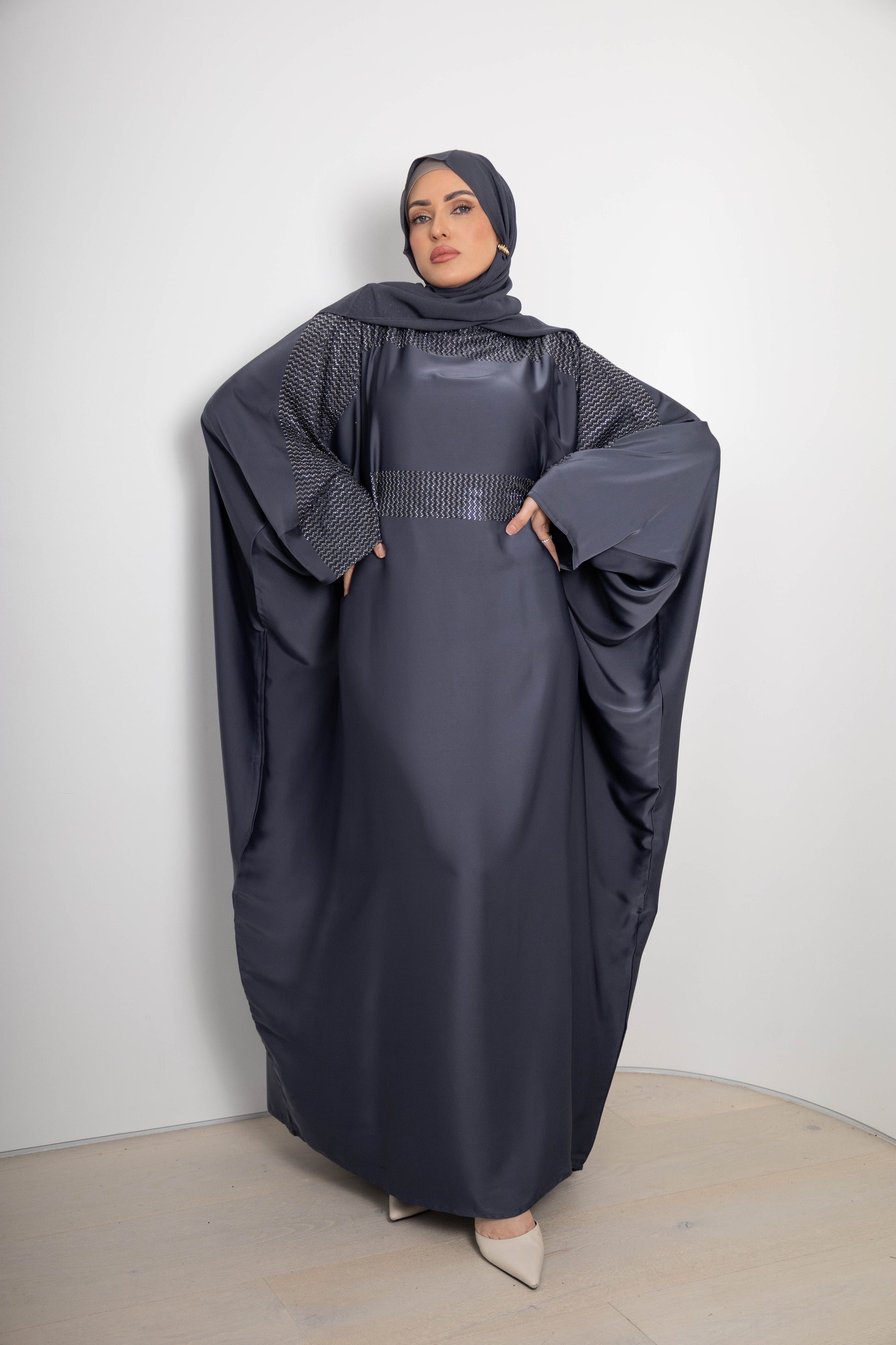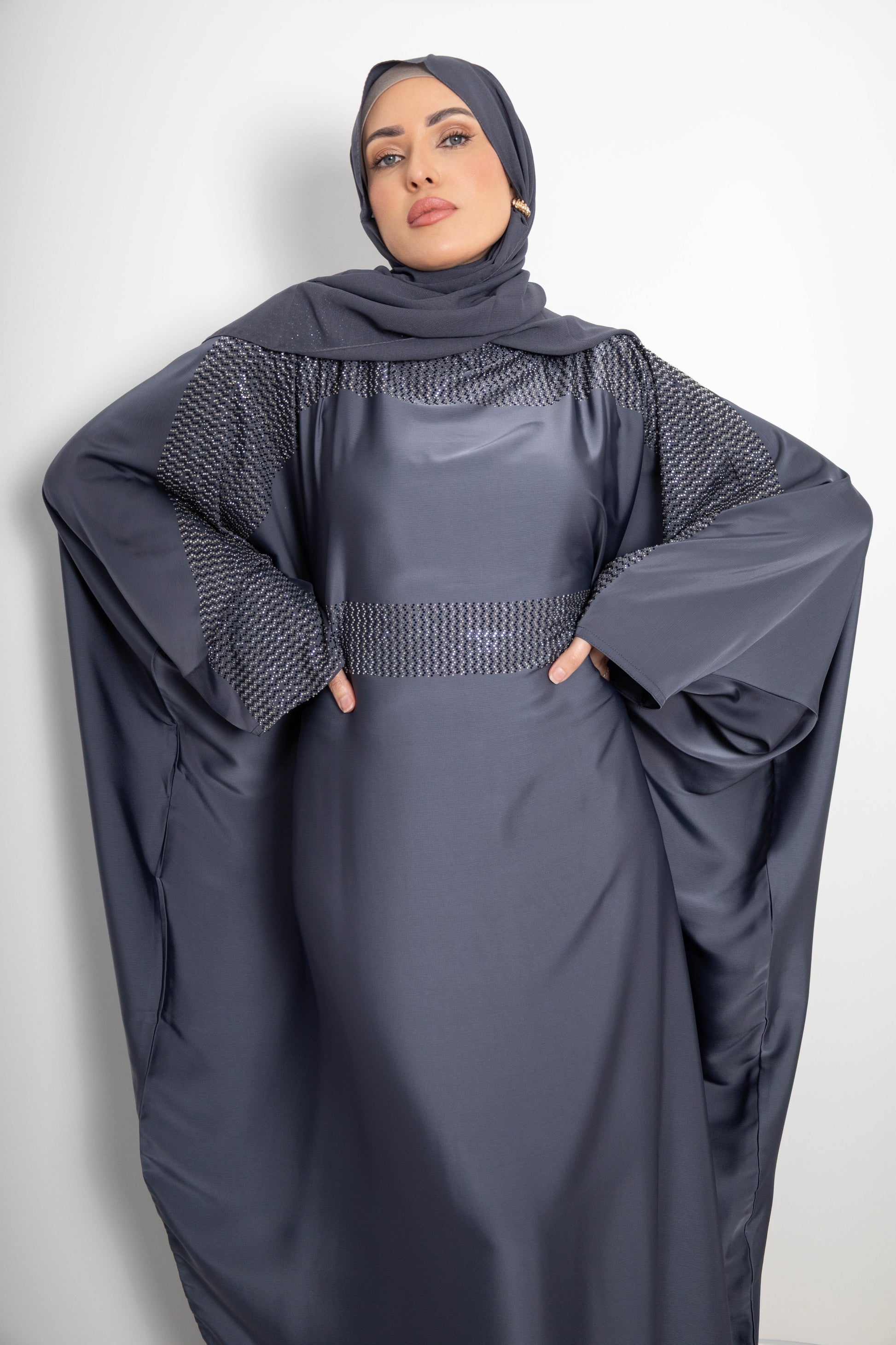 Elegant and understated, Sahar Abaya redefines classic with its soft embellishment and flattering silhouette. This 2-piece batwing abaya features scattered beadwork across the shoulders and upper sleeves, offering just the right amount of texture and shine. Comes with matching beaded scarf.